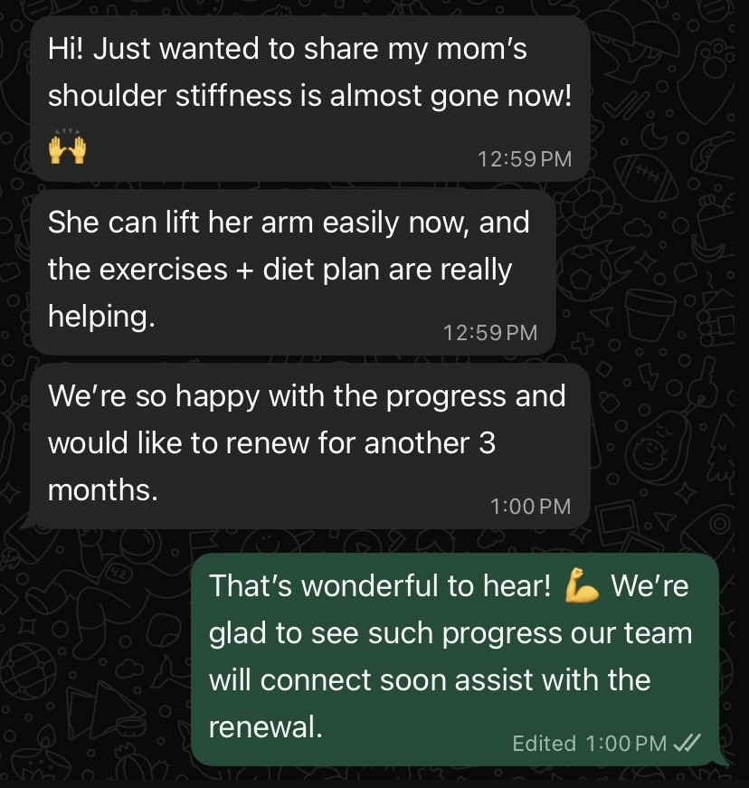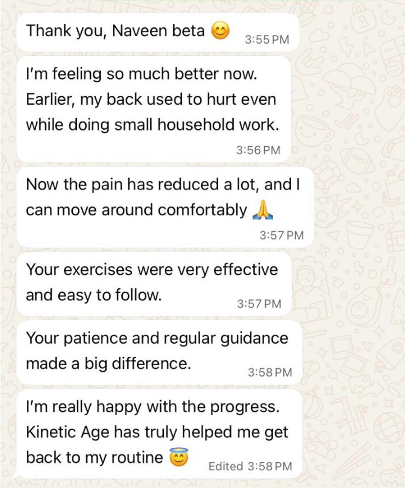 I am feeling far more energetic now, and my knee pain has drastically reduced since I started my sessions with Kinetic Age. The pain in my neck and shoulders is completely gone. I have already signed up for another session, and I am confident that my pain will soon be totally gone, allowing me to walk with full stability again. Huge thanks to Anjana and Deepika for their expert guidance.