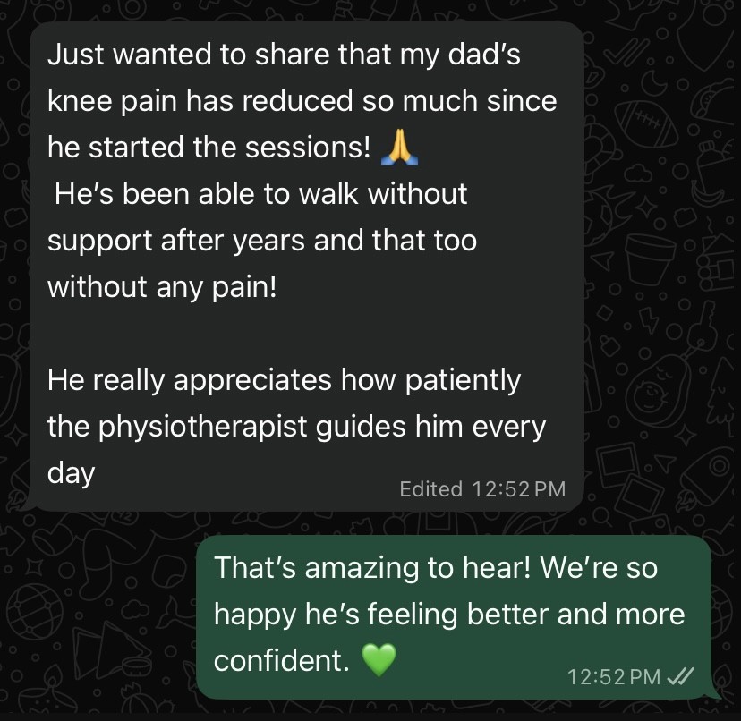 Saw their Facebook ad and booked a free trial. They responded quickly. Physio Naveen arrived on time, understood the issue, and suggested helpful solutions.